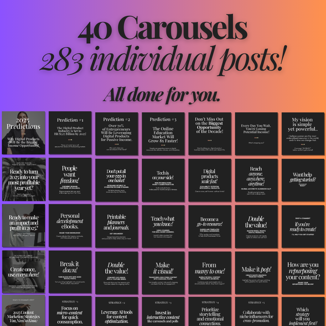 40 Done-For-You Carousels and 283 Posts: These carousels are designed based on the most-asked questions in the passive income niche, taking the guesswork out of what to post.